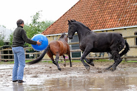 Feye heeft 2 nare dagen gehad, maar daarvóór had hij 12 goede jaren. Deze foto is vorig jaar augustus gemaakt. Het had enorm geregend en de paardenbak lag vol plassen. Speelkwartier voor Inge, Melvin en Feye.